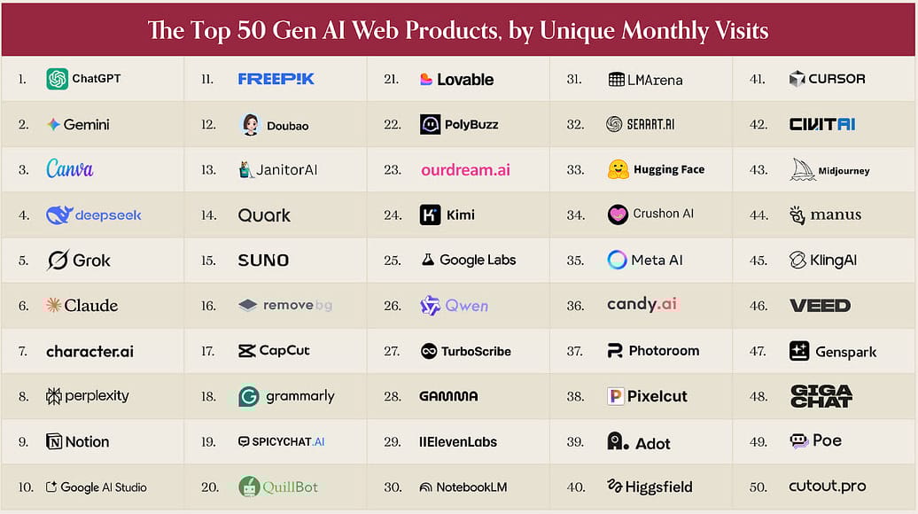 The latest ranking of the top 100 consumer AI apps paints a picture of a maturing market. For the first time, the list now includes mainstream tools like CapCut, Canva, and Notion, where AI has quietly become central to the core experience rather than a bolt-on feature.