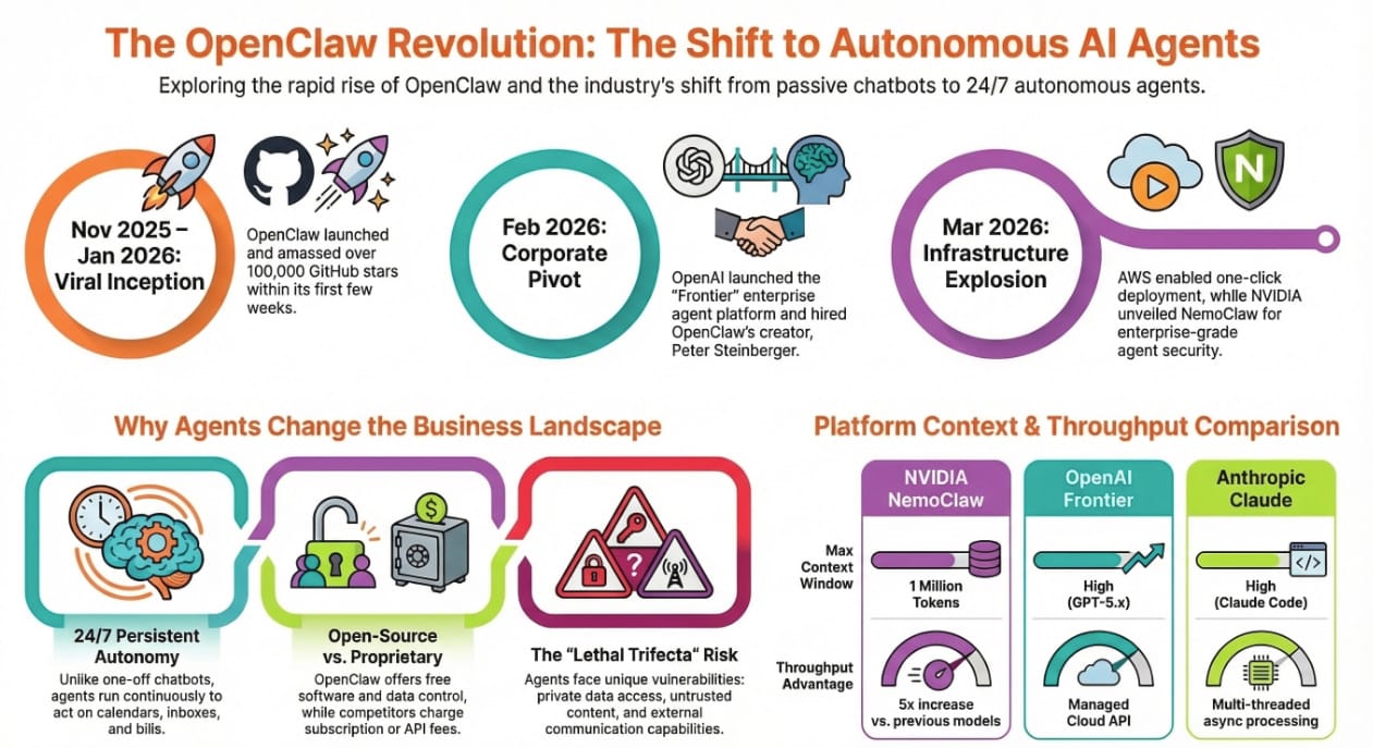 NVIDIA, AWS, Anthropic, and OpenAI are responding with their own agent-focused platforms (NemoClaw, Lightsail OpenClaw instances, Claude Code Channels, Frontier).