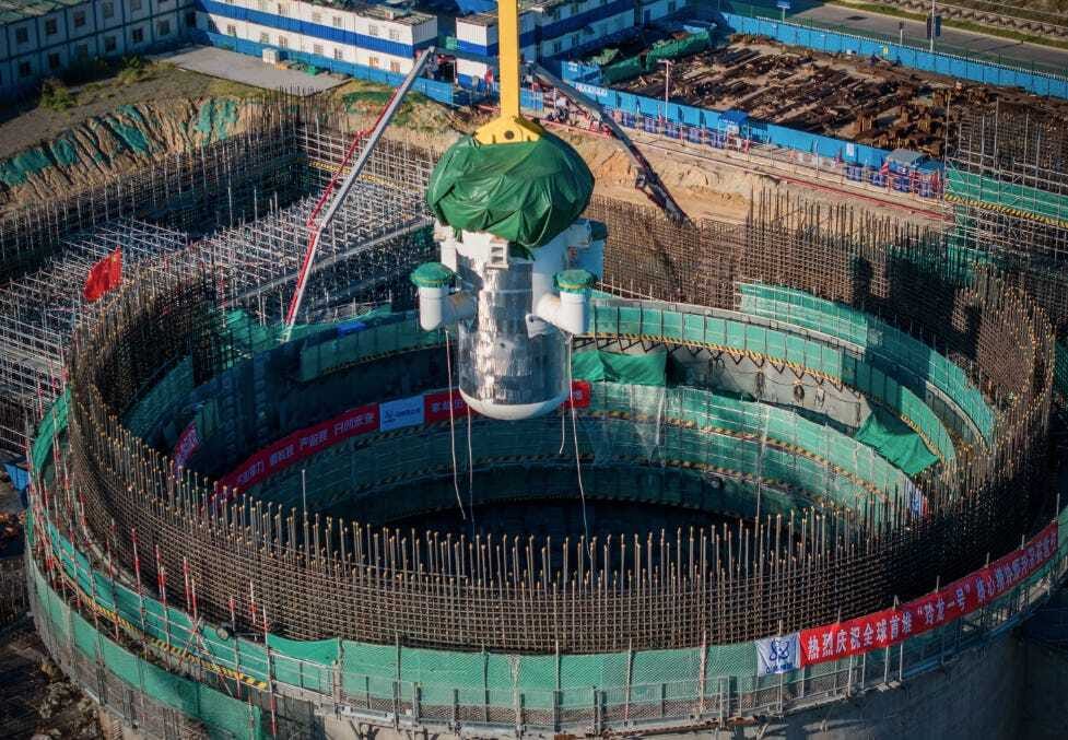 China’s Linglong One, the world’s first land-based commercial small modular reactor, should come online in 2026. Construction crews installed the core module in August 2023.