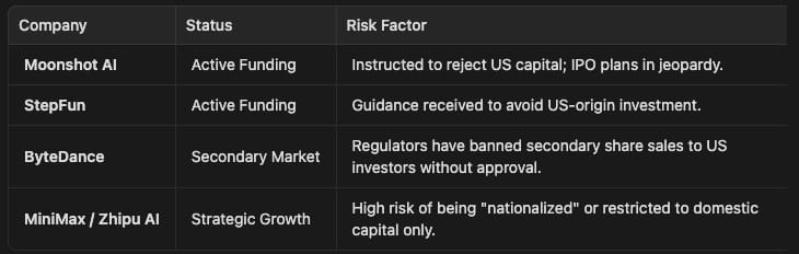 Beijing has moved to insulate its “national champions” in the AI sector from American influence. Regulators have reportedly issued direct guidance to several top-tier AI startups to reject US capital in future funding rounds.