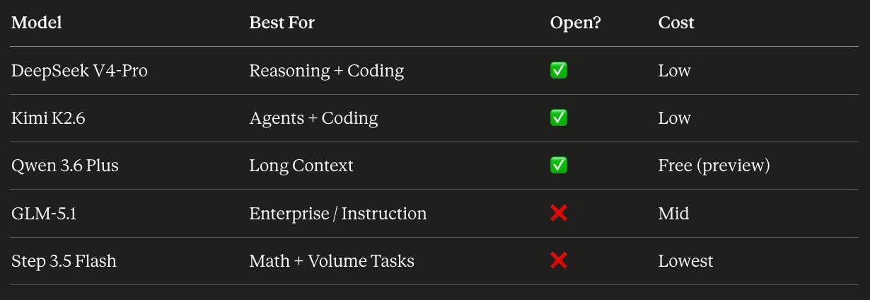 🥇 1. DeepSeek V4-Pro - Trailing only Google’s Gemini 3.1-Pro on world knowledge, and falling only marginally short of GPT-5.4 overall. Like its predecessors, V4-Pro is fully open-source, which has been China’s key competitive strategy, rapidly scaling adoption while working around US chip export restrictions.